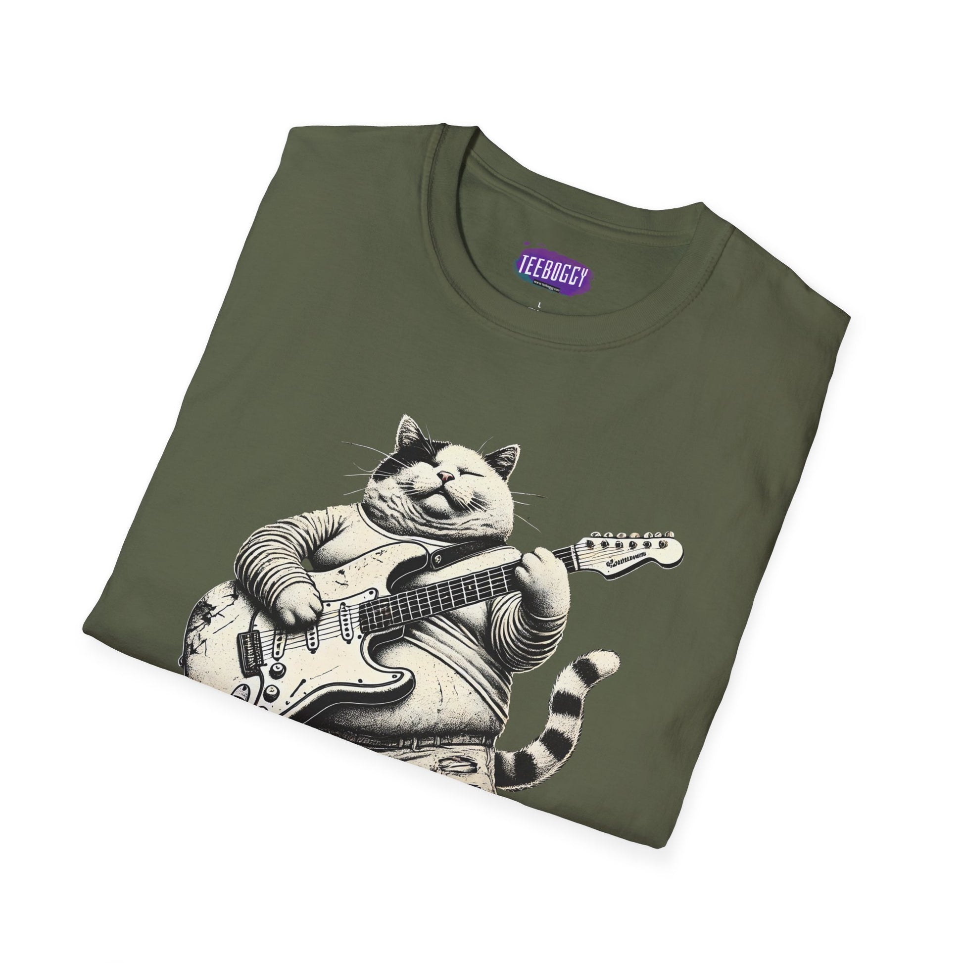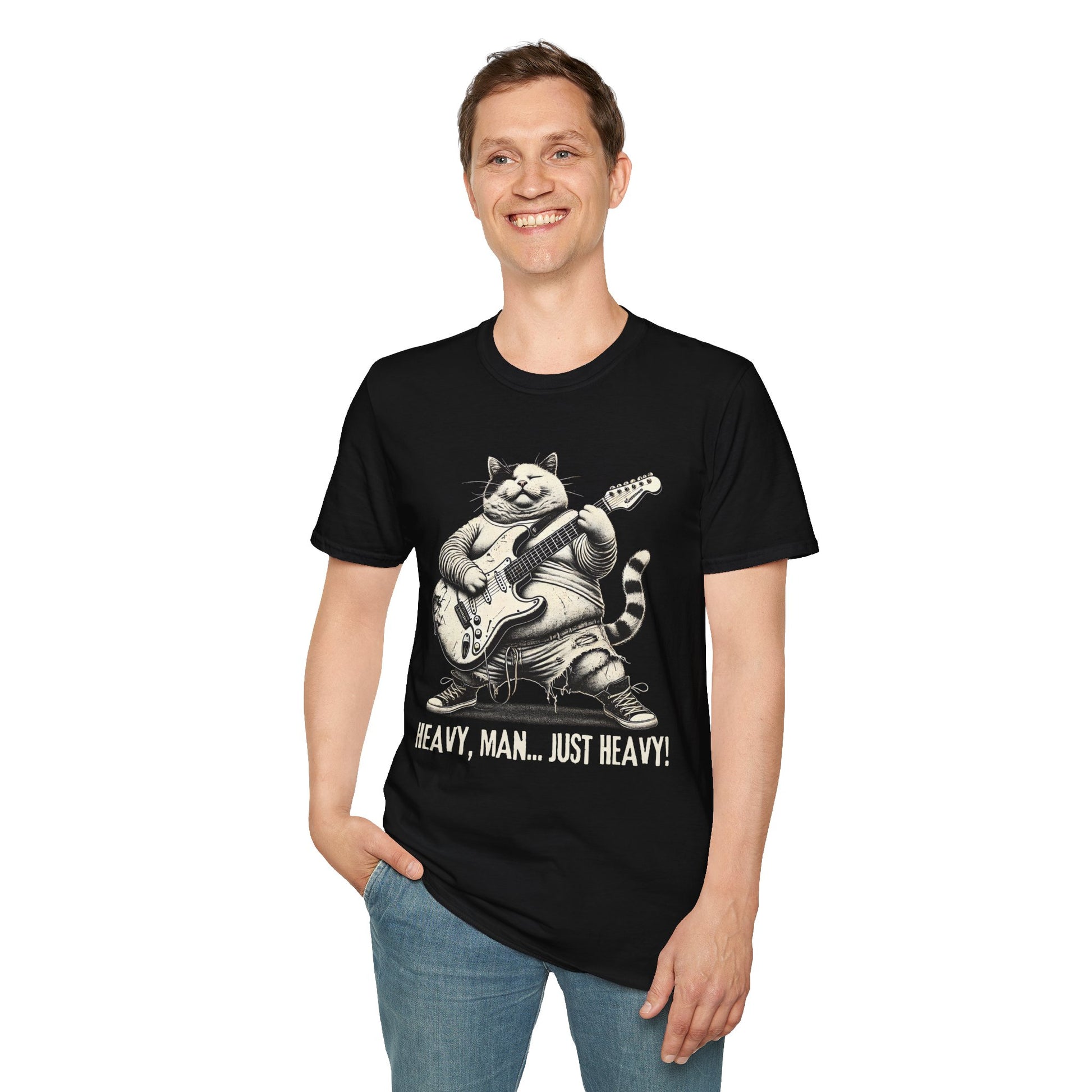 A fun T-Shirt design featuring an image of an overweight cat playing a stratocaster rock guitar, with a slogan that says - heavy, man... just heavy! This T-Shirt is perfect for music lovers and cat enthusiasts looking to add a playful and quirky element to their wardrobe. It is ideal for casual wear and can be a great conversation starter. Suitable for adults and relevant for music-themed parties, casual hangouts, and everyday wear.