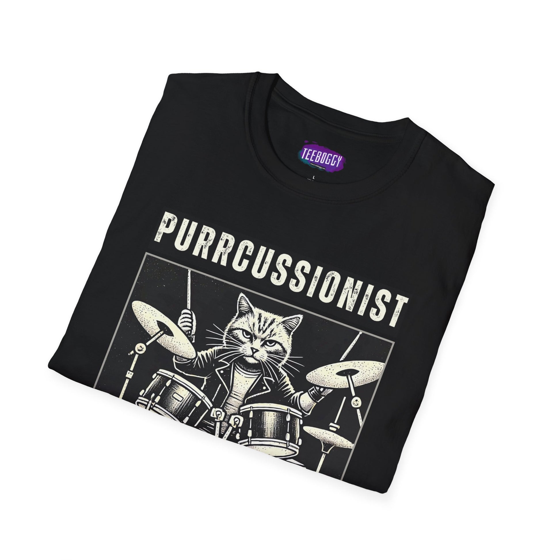 This fun T-shirt features an image of a cat rocker playing the drums with the slogan 'purrcussionist, cats rock my world.' It gives off a playful and music-loving vibe, perfect for cat lovers and music enthusiasts. This T-shirt can be a great addition to everyday casual wear or a standout piece for music-themed events or cat lover gatherings.