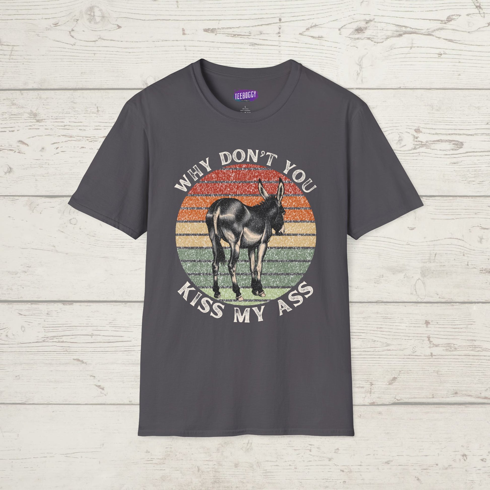 A funny quote T-shirt featuring an image of a donkey, otherwise known as an ass. The slogan says - 'why don't you kiss my ass'. This T-shirt exudes a light-hearted and humorous vibe, perfect for casual wear or as a conversation starter. Ideal for those who enjoy quirky and witty apparel. Relevant for casual occasions, gift-giving, and everyday wear.