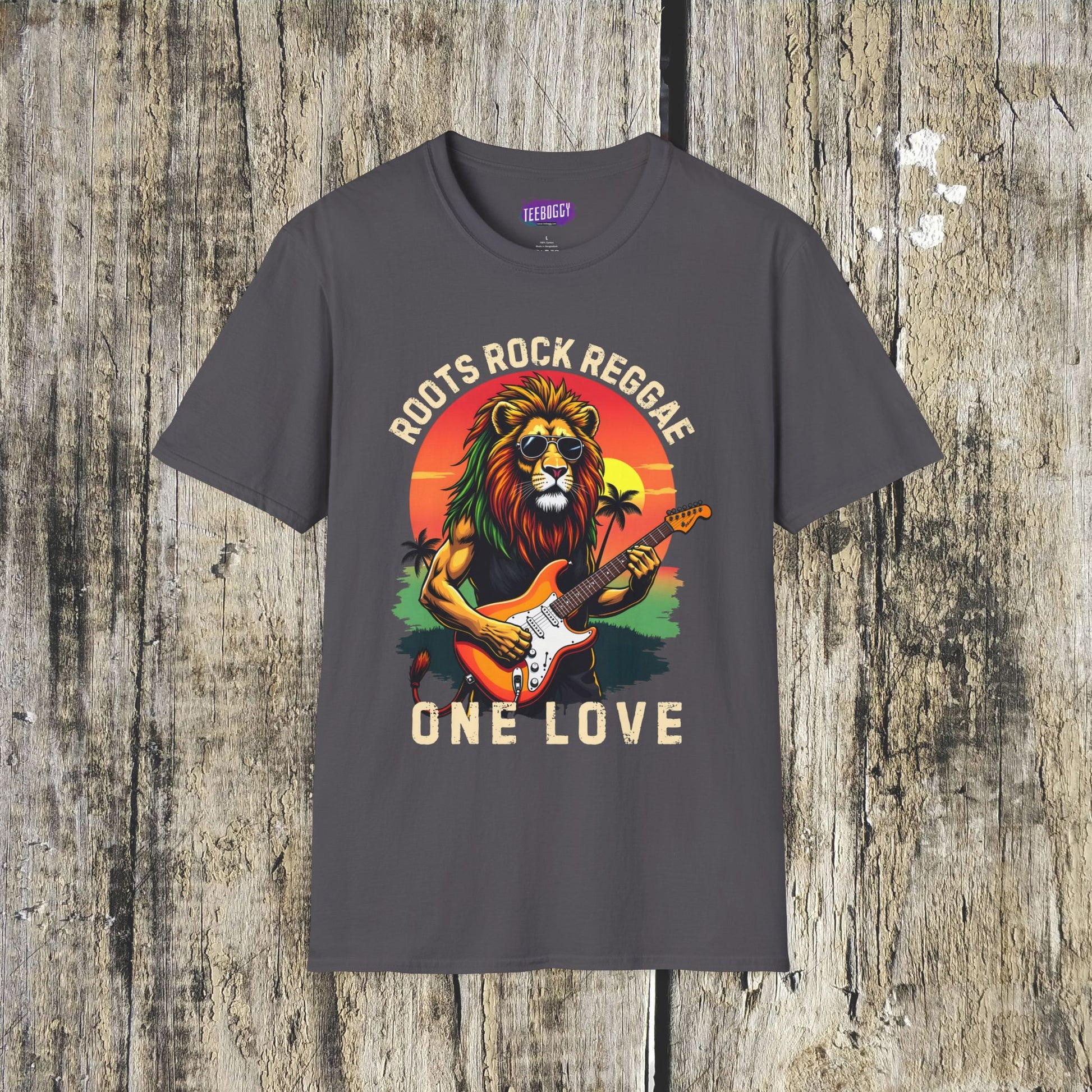A trendy and unique T-Shirt featuring a Zion Lion playing a guitar against a retro sunset background with the slogan 'Roots Rock Reggae, One Love'. This shirt exudes a cool and laid-back vibe, perfect for music enthusiasts and those who appreciate artistic designs. Ideal for casual wear, concerts, music festivals, and everyday activities.