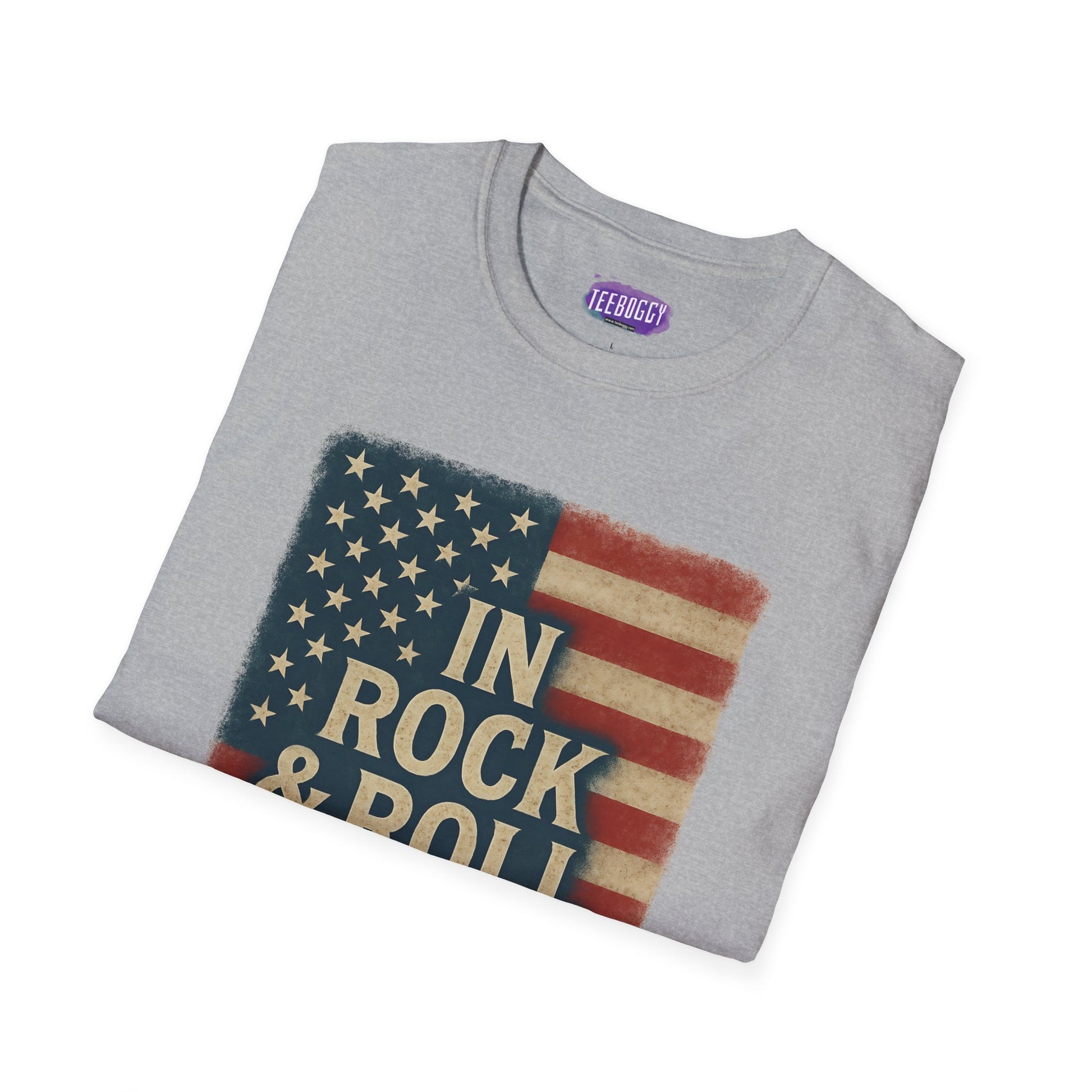 A patriotic t-shirt design for rock n roll lovers, featuring an image of the USA flag with the slogan 'We Trust in Rock & Roll'. Perfect for those who enjoy music and want to show their patriotic spirit. Ideal for Fourth of July celebrations and music festivals.