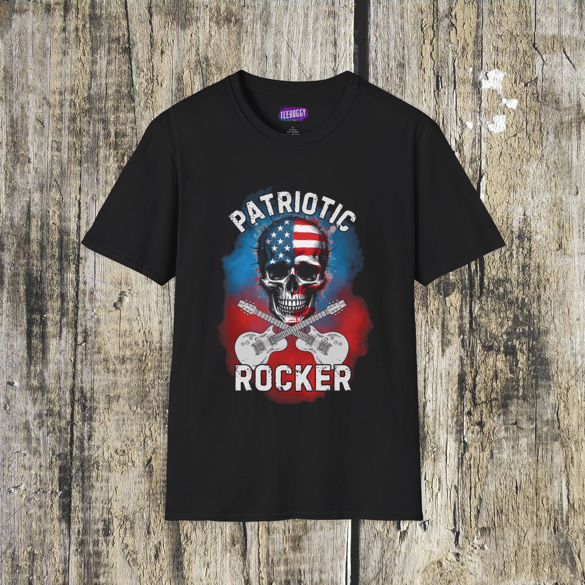 A cool patriotic T-Shirt featuring an image of a skull with the American flag theme slogan saying - Patriotic Rocker. Perfect for those who want to show their patriotic spirit in a rock and roll style. Ideal for Fourth of July celebrations and other patriotic holidays.