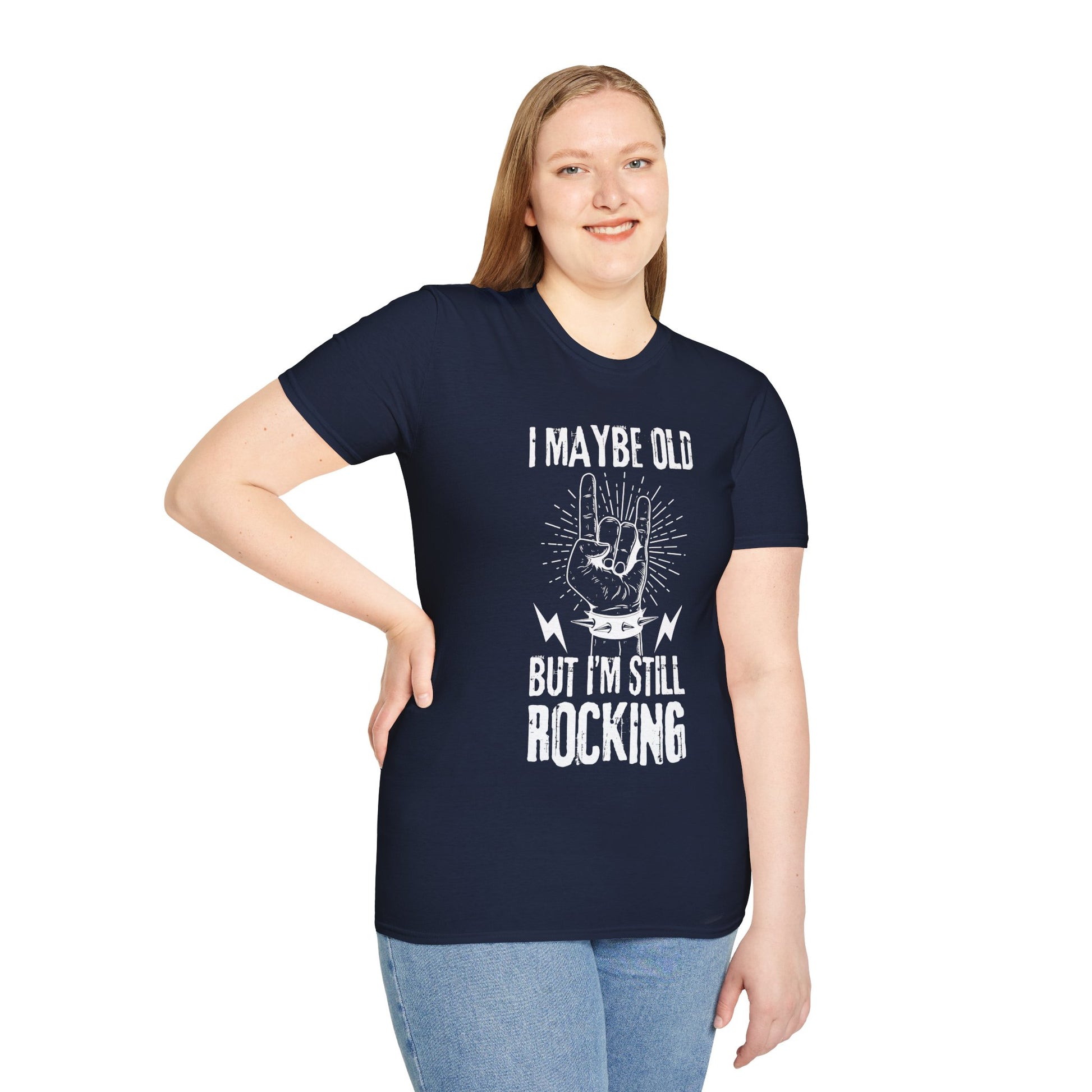 A T-shirt designed for the more mature/senior rockers, featuring a defiant rock fist image with the slogan - I may be old, but I'm still rocking. This shirt exudes a sense of rebellion and solidarity, perfect for those who still embrace their rock and roll spirit. Ideal for adults who want to showcase their rock attitude, especially during concerts, music festivals, or casual gatherings.
