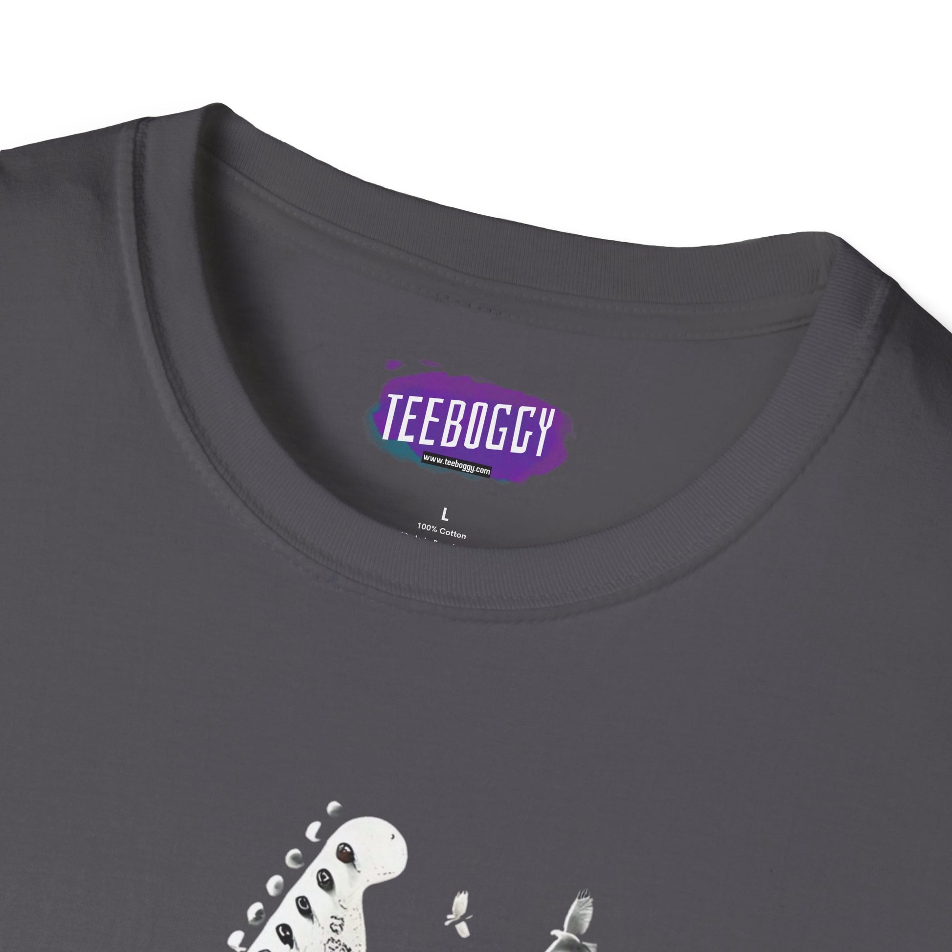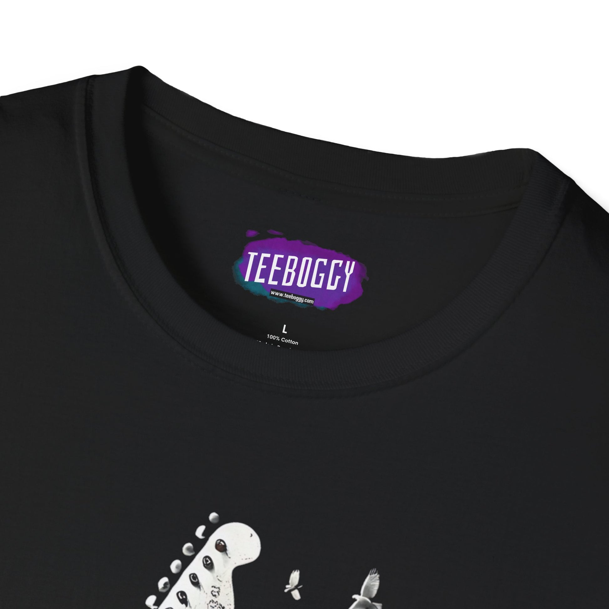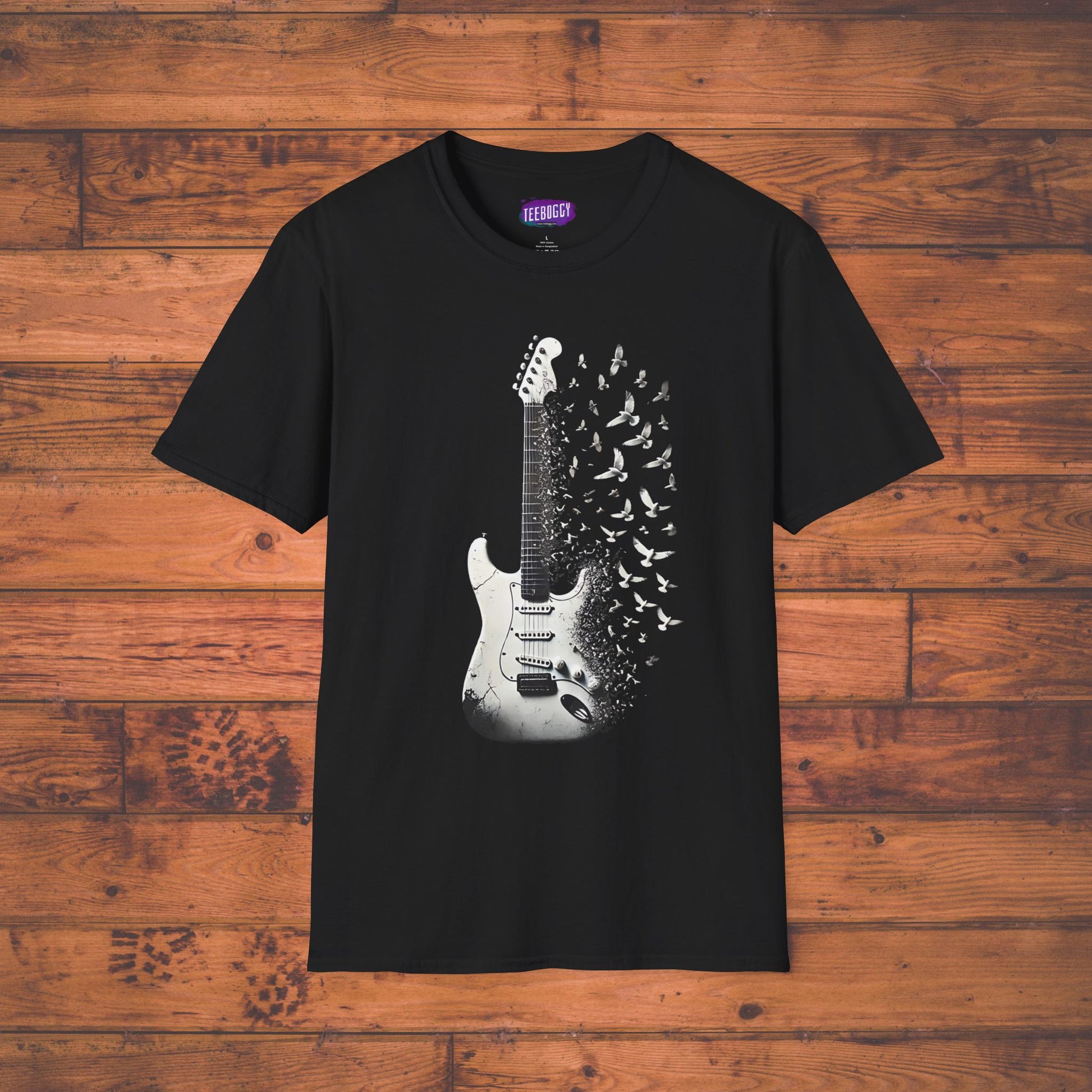 A statement tee featuring a detailed front-facing rock guitar design with the body and fingerboard transforming into birds, all in a gritty monochrome style. Perfect for those who love music and want to make a bold fashion statement. Suitable for adults and great for casual wear, concerts, music festivals, and rock-themed events.