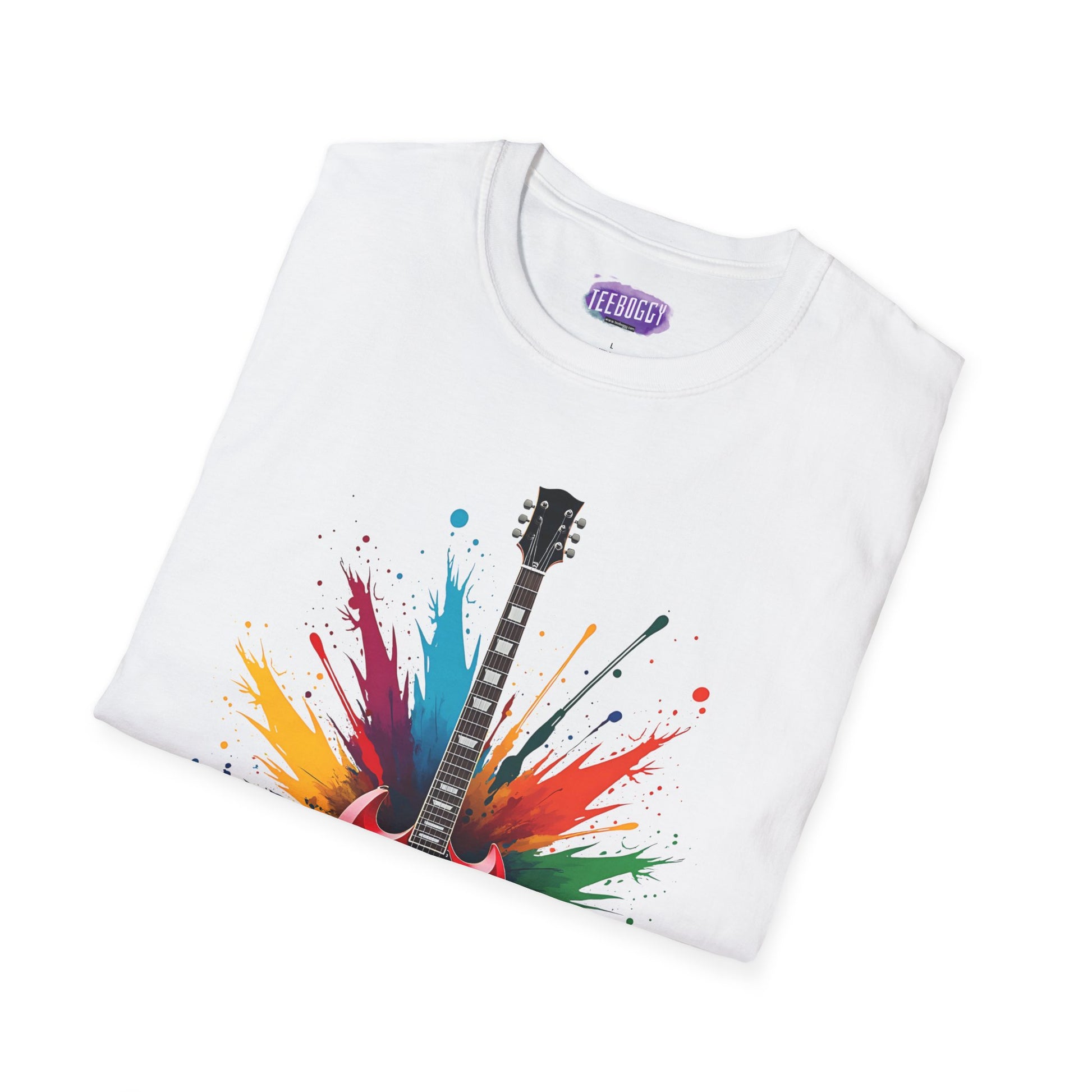 This cool T-Shirt features an image of a rock SG shape guitar with a colorful paint splash background. It offers a versatile style that can match any occasion, whether formal or semi-formal. Made with 100% ring-spun cotton, it is lightweight and comfortable to wear all year round. Perfect for music lovers and those who appreciate unique designs, this T-Shirt is ideal for casual outings and events.