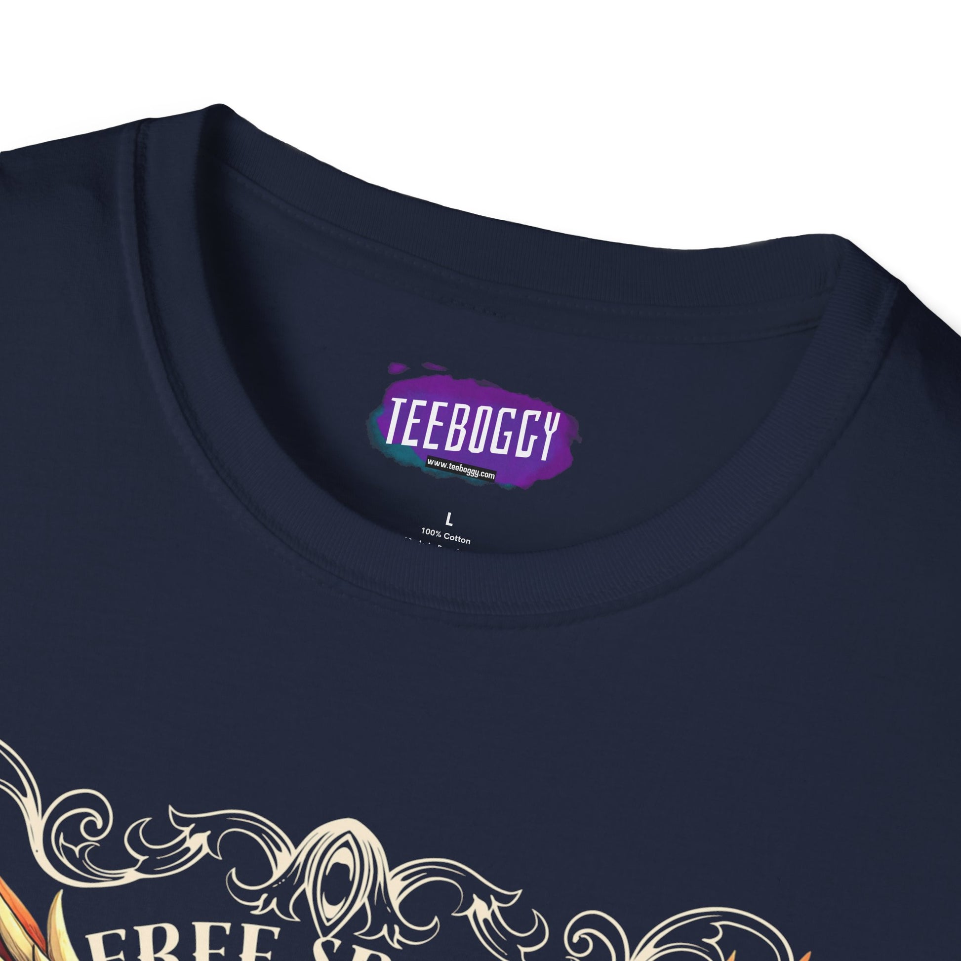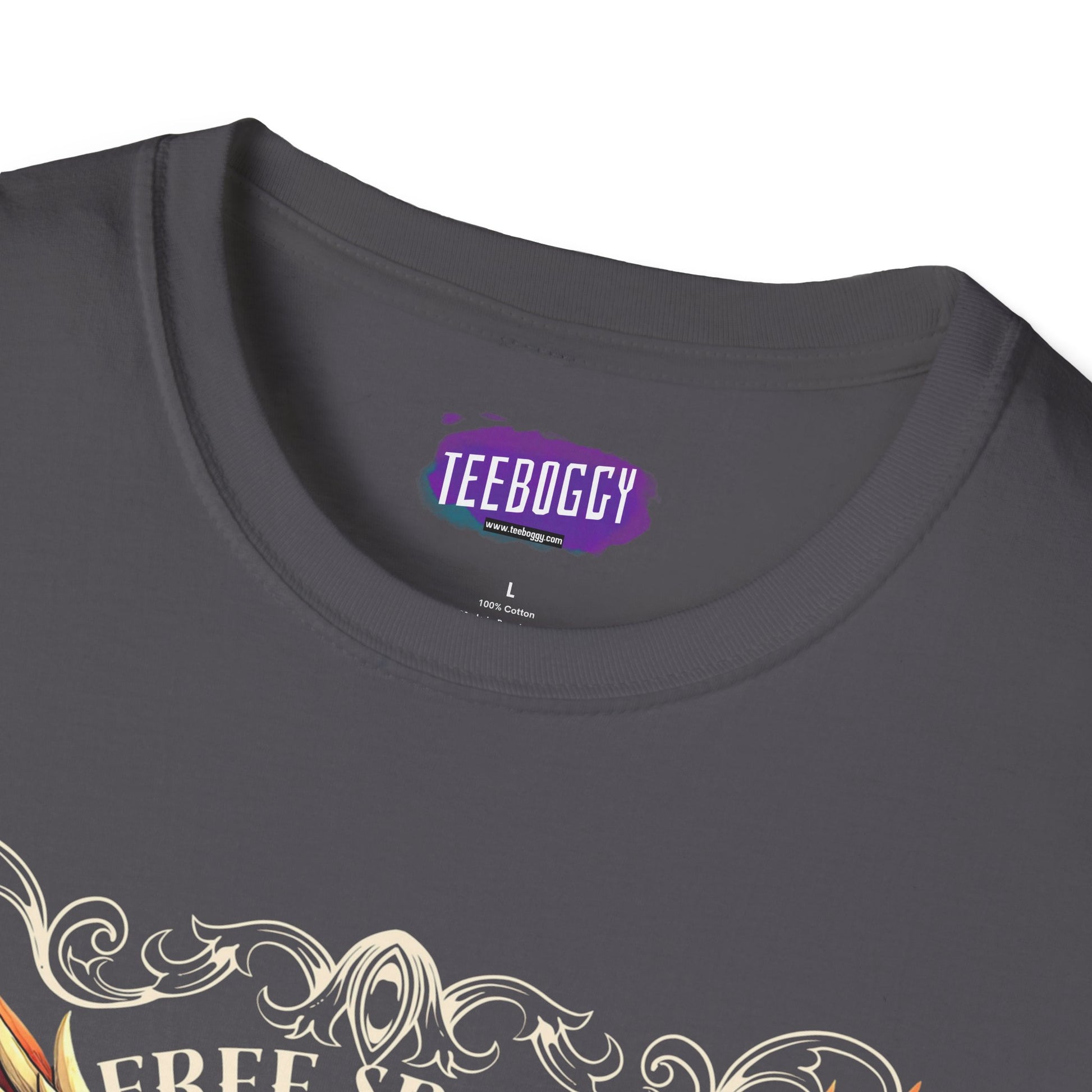 A cool t-shirt featuring a winged rock girl playing a rock stratocaster guitar with the slogans 'Free Spirit' and 'Rock & Roll'. Perfect for ladies who want to express their love for rock music and free-spirited outlook on life. Ideal for music lovers and those who enjoy showcasing their personality through their clothing. Relevant for music festivals, concerts, casual outings, and everyday wear.