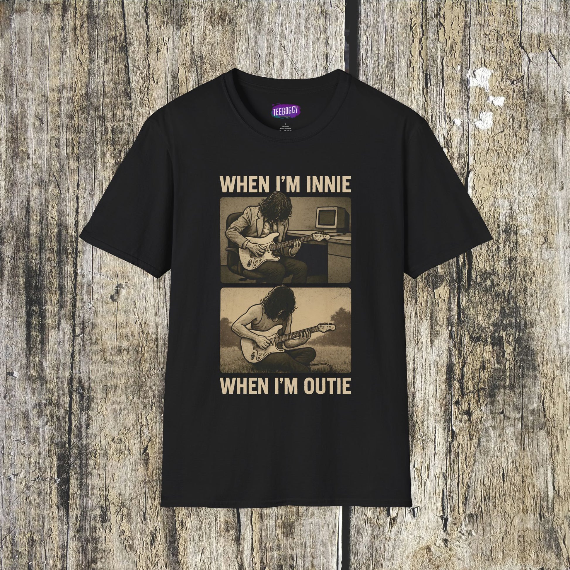 A fun t-shirt design inspired by the hit TV series Severance, featuring a split image of a guitarist playing his guitar in his workplace and in his own time. The slogan says - When I'm Innie, When I'm Outie. This unisex softstyle t-shirt is made with 100% ring-spun cotton, lightweight and comfortable for year-round wear. The classic fit and crew neckline offer a versatile style suitable for any occasion, from formal to semi-formal.