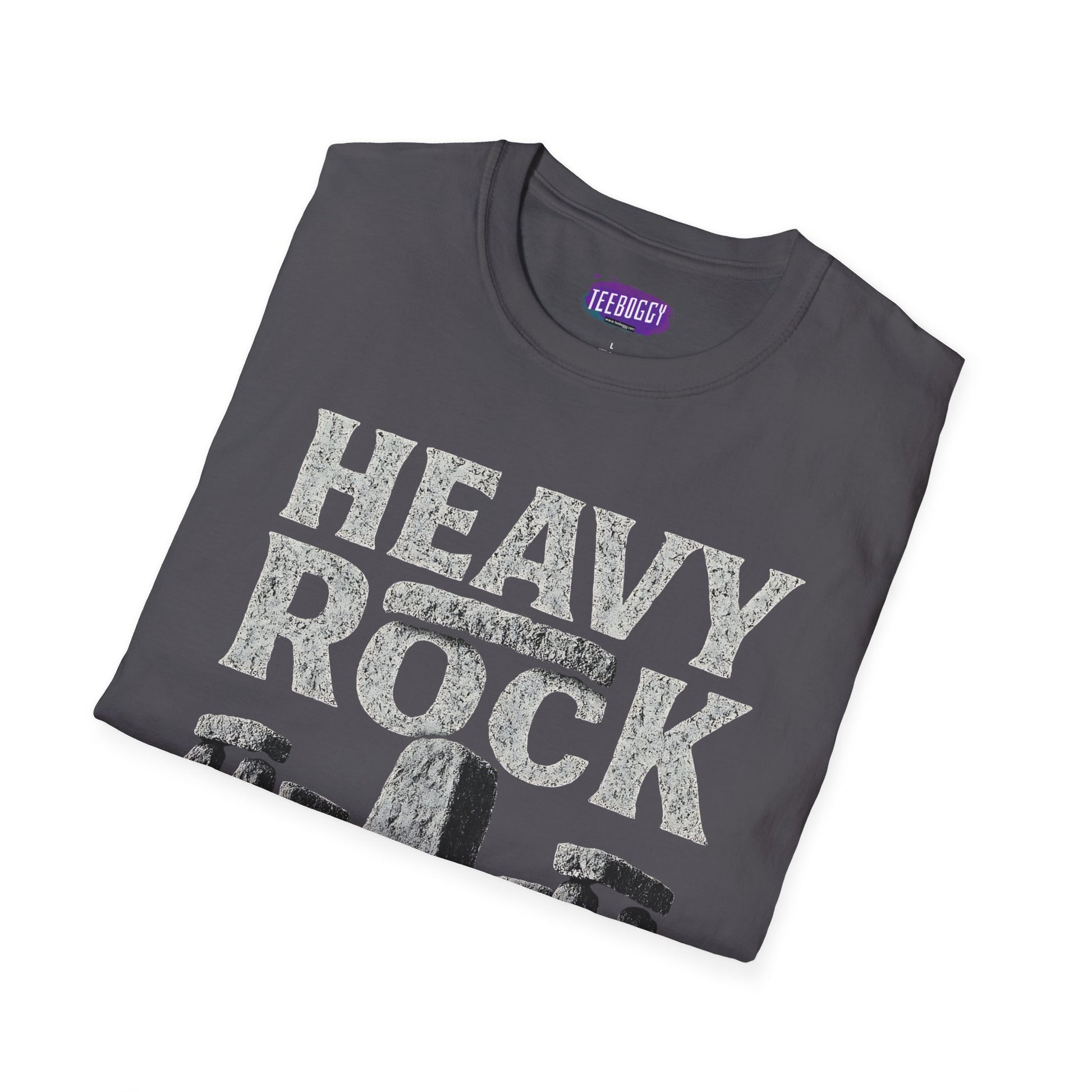 A unique t-shirt featuring a design of the UK landmark Stonehenge with text that spells out 'Heavy Rock'. This t-shirt gives off a mysterious and ancient vibe, perfect for history enthusiasts and rock music fans. Ideal for casual wear or as a statement piece for concerts or music festivals.